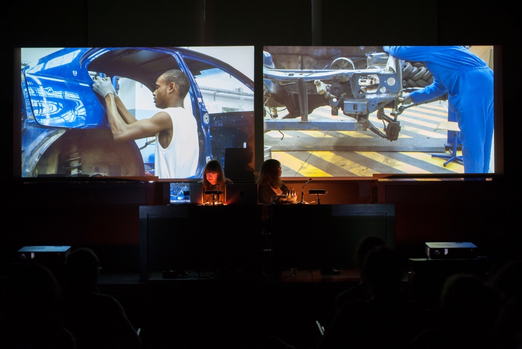 La Chorégraphie du travail est le titre d’une série de conférences-performances qui se développera ensuite sous la forme d’un film. Le projet questionne la relation entre le travail et l’art, abordant des problématiques telles que la représentation des processus de production et les relations de pouvoir dans le film, l’utilisation de formes artistiques dans les mouvements ouvriers, la manière dont les méthodes artistiques furent utilisées en vue d’accroître la rentabilité de la production industrielle, ou encore les principes qui sous-tendent les programmes de formation dans les agences pour l’emploi. En reconstruisant différentes interconnexions entre ces éléments de réflexion, selon une perspective à la fois historique et contemporaine, La Chorégraphie du travail tend à enquêter sur les liens existants entre les sphères du travail et de l’art. Cette réflexion sert également de point de départ pour reconsidérer le rôle du corps dans l’art/le film/la production – quand le corps est compris comme un espace d’investigation et d’expérimentation pour la mise en place de stratégies d’efficacité et d’éducation.