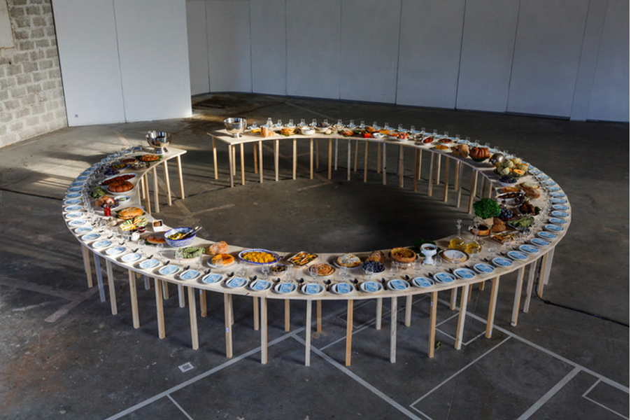 Initié en 2007, les Banquets de Fabien Vallos font advenir des moments de partage comme la possibilité d’une œuvre. Ils impliquent la définition de protocoles dont certains sont spécifiques pour chaque invitation. Le premier protocole est déterminé entre l’artiste et le commanditaire en relation au projet spécifique. Le second protocole suppose la rédaction d’un texte et d’une édition de présentation qui accompagne un banquet. Le troisième protocole suppose le respect de certaines contraintes : la proximité des produits et leur faible impact écologique, un service à la française en ambigu permettant l’absence de service et la présence au banquet de celles et ceux qui l’ont réalisé, une table unique, l’absence de professionnels, la présence de volontaires, la quasi-absence de discours et de présentation. Enfin le quatrième protocole suppose qu’un banquet doit être éprouvé par les convives et les organisateurs.