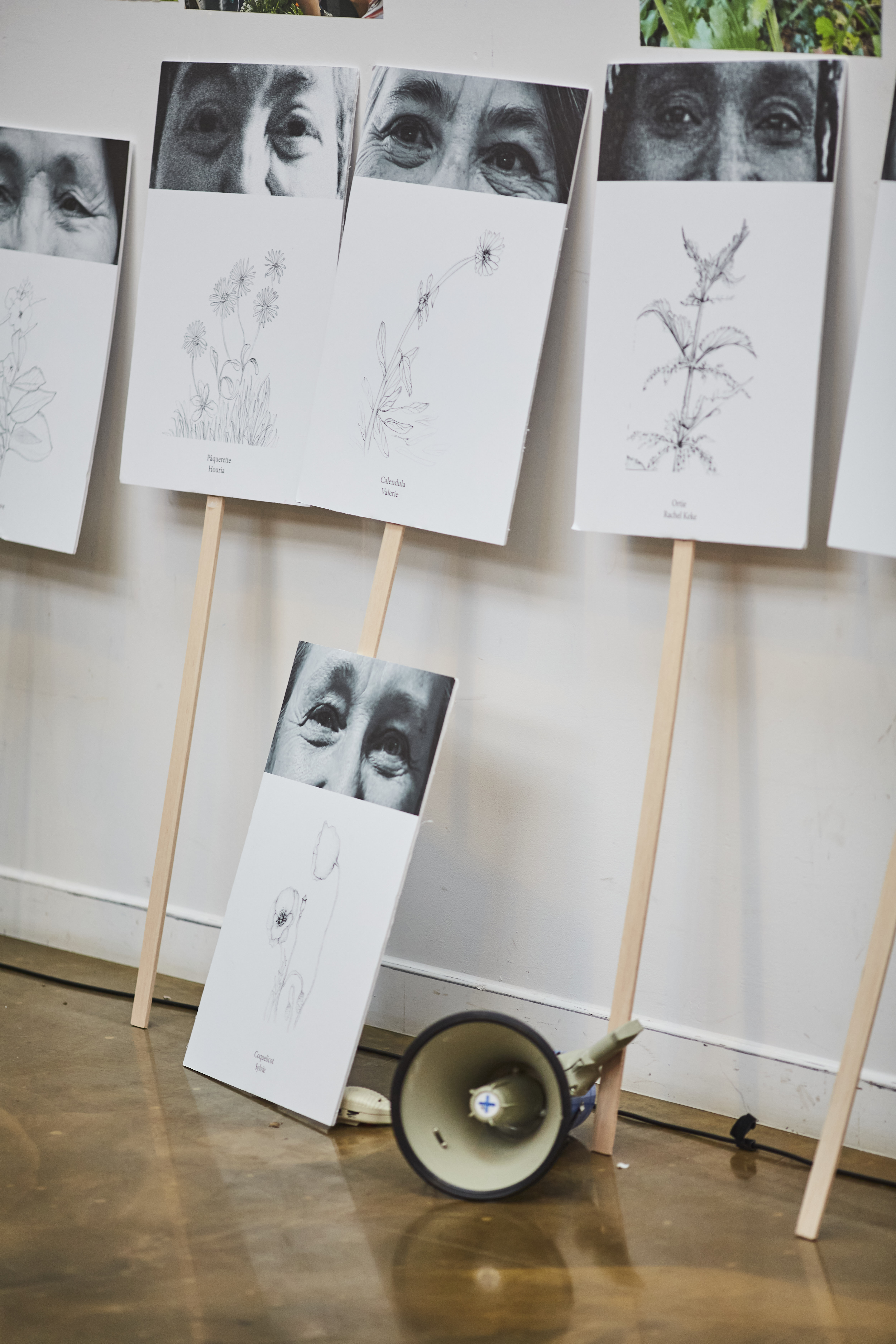 Collées à même le mur, des photos des ateliers hebdomadaires organisés dans ce cadre (botanique, dessin, chant, écriture, enregistrement et montage sonore) côtoient des extraits de lettres écrites par Rosa Luxemburg lors de son séjour en prison, ainsi que les affiches créées pour l’événement de clôture du projet - une manifestation végétale dans les rues d’Aubervilliers.