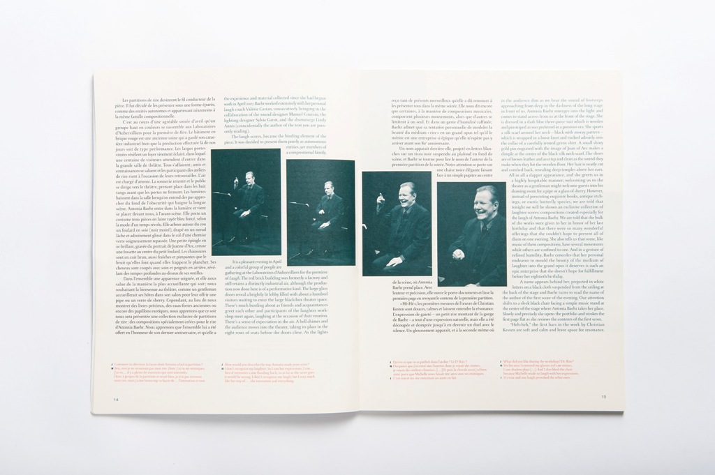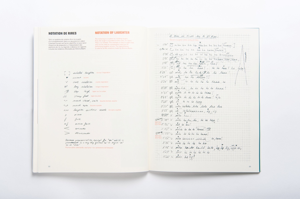 Laugh is a self-portrait through the eyes of others. Antonia Baehr is the one laughing. She laughed and wondered as she laughed – "what exactly happens in my body at that precise moment?" Laughter then became the subject of a research project in the form of workshops, musical scores, playing of musical scores, then a show and a book. The artist is not only interested in the mechanics of laughter and its physiological components, but also in its quality as an action, an expression with no causes, a simple physical and sonorous demonstration. She also turned her attention to the parentage of this laughter. Who is the creator of my laugh? And who is the creator of the laughs of those people I imitate? The book Rire – Laugh – Lachen is an archive of this project. It is intended to be a practical piece, a collection of scores and exercises.